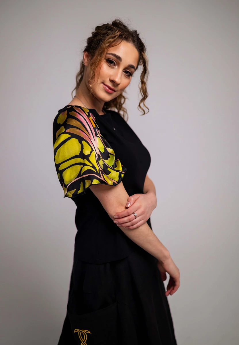 Bluzka z dzianiny z oryginalnymi rękawami z naturalnego jedwabiu to połączenie komfortu i wyrafinowanego stylu. Wykonana z wysokiej jakości dzianiny, bluzka zapewnia nie tylko wygodę noszenia, ale także doskonałe dopasowanie do sylwetki. Jej oryginalne rękawy z naturalnego jedwabiu dodają jej elegancji i charakteru, nadając niepowtarzalny wygląd. Ta bluzka jest idealna zarówno na spotkania biznesowe, jak i na bardziej casualowe okazje, dodając subtelnego luksusu każdej stylizacji.