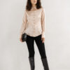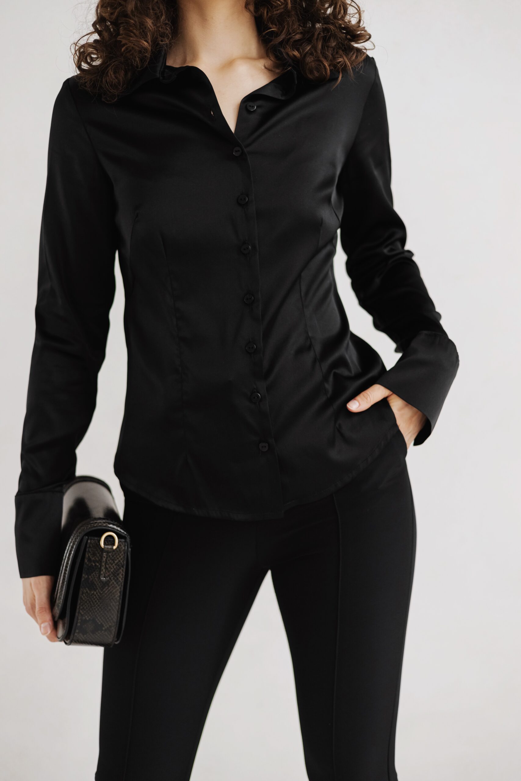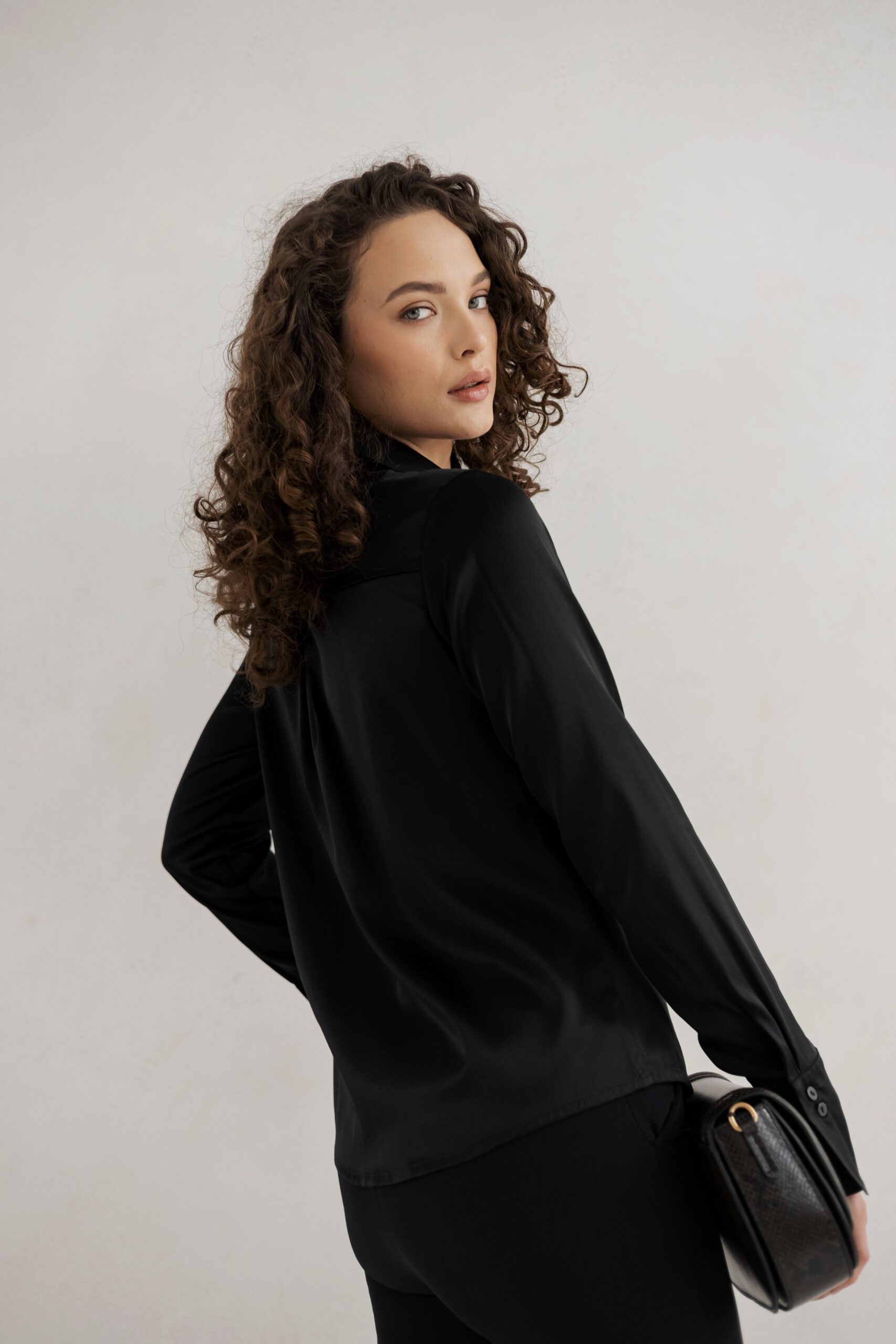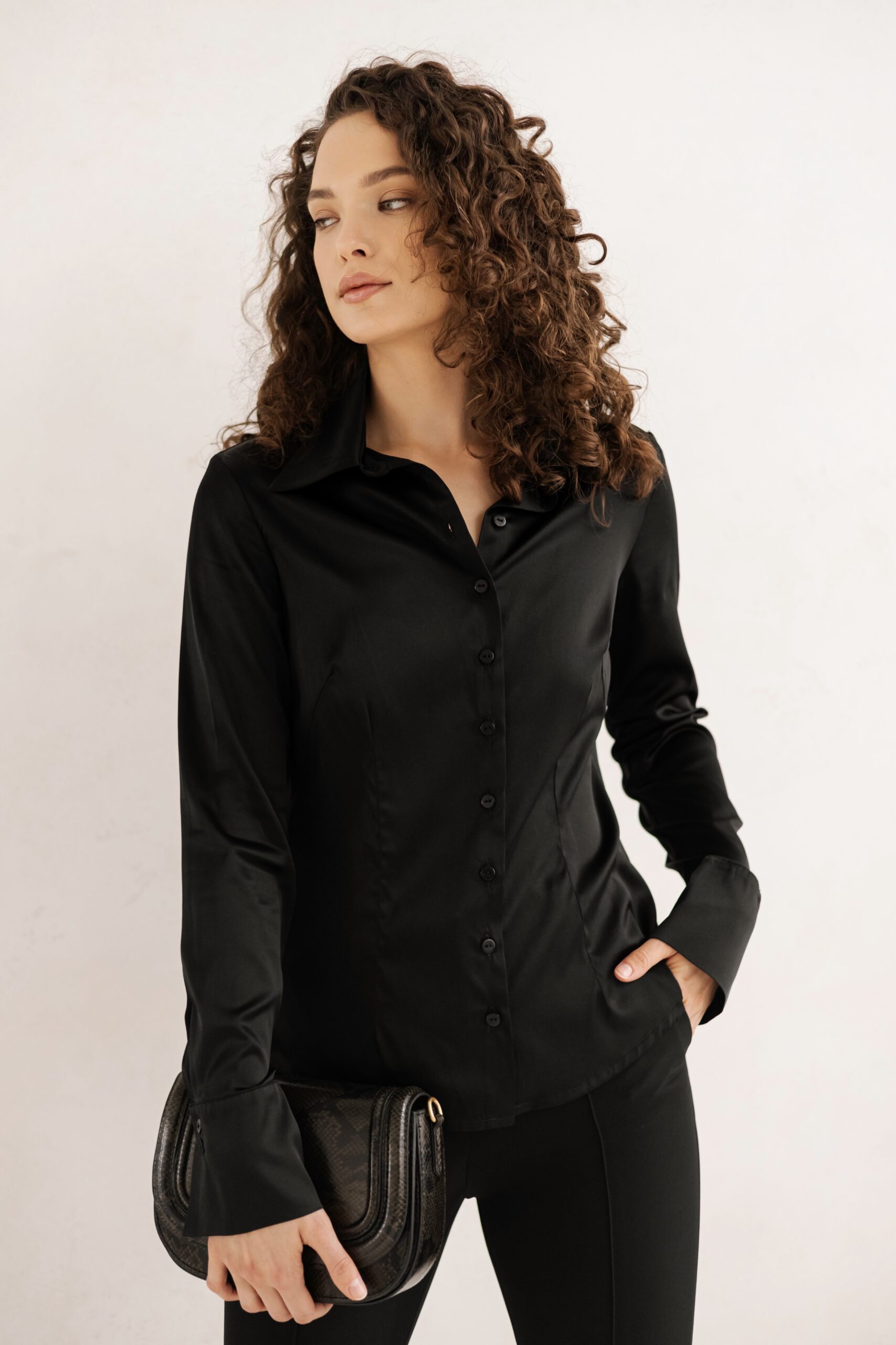 Elegancka jedwabna koszula pasuje do stylizacji o różnym charakterze, posiada klasyczny kołnierzyk, odwijane mankiety zapinane na guziki i zaokrąglony dół.