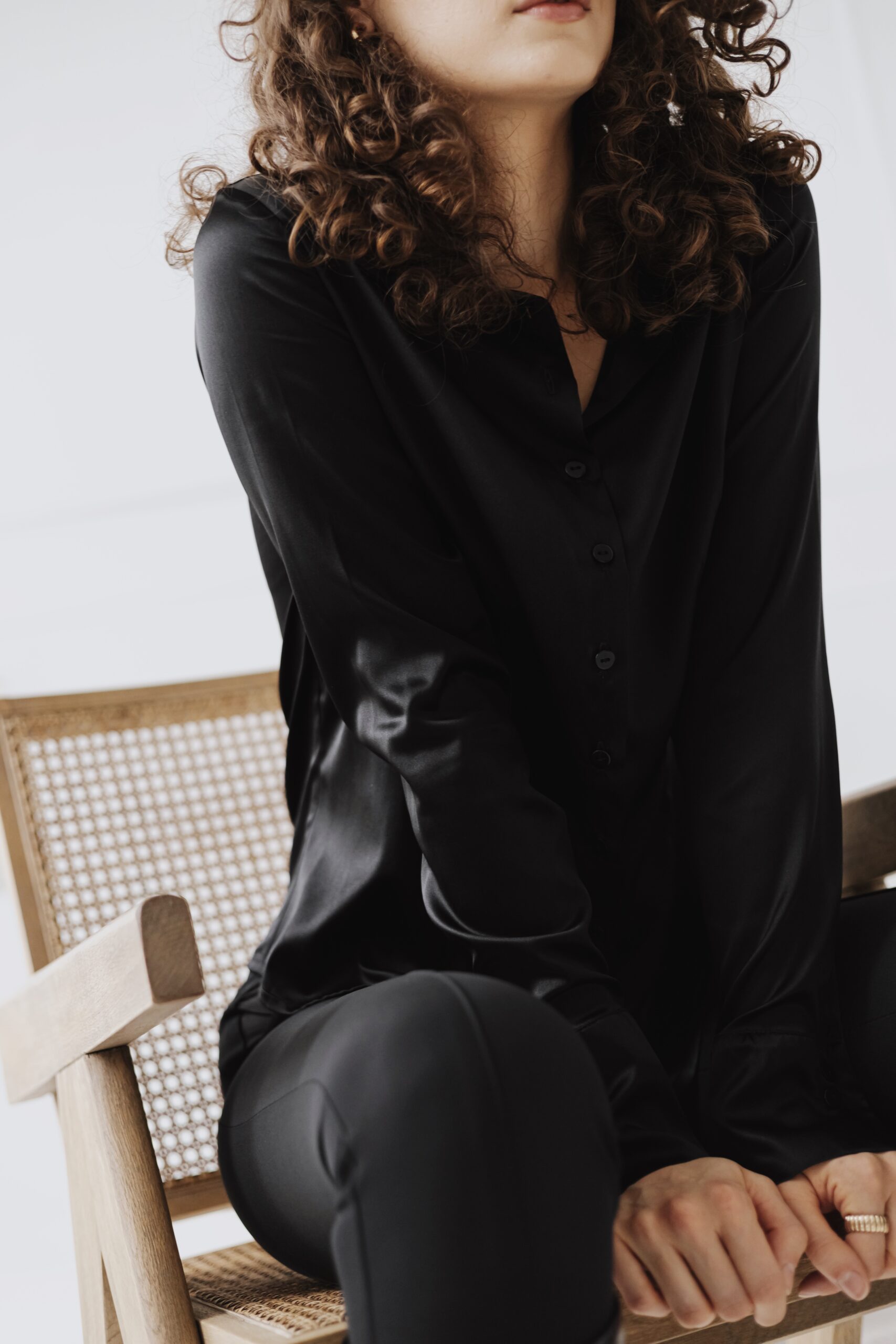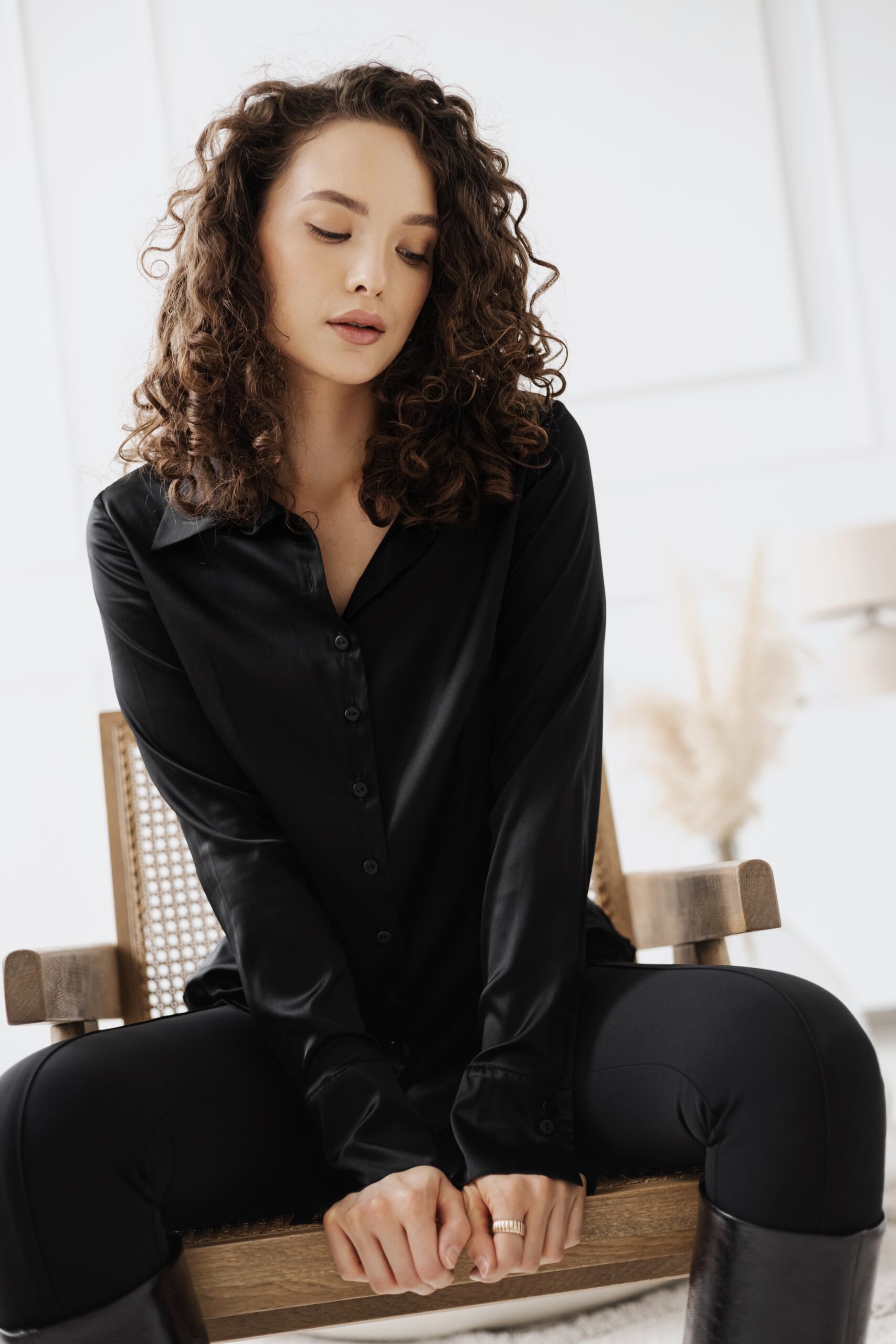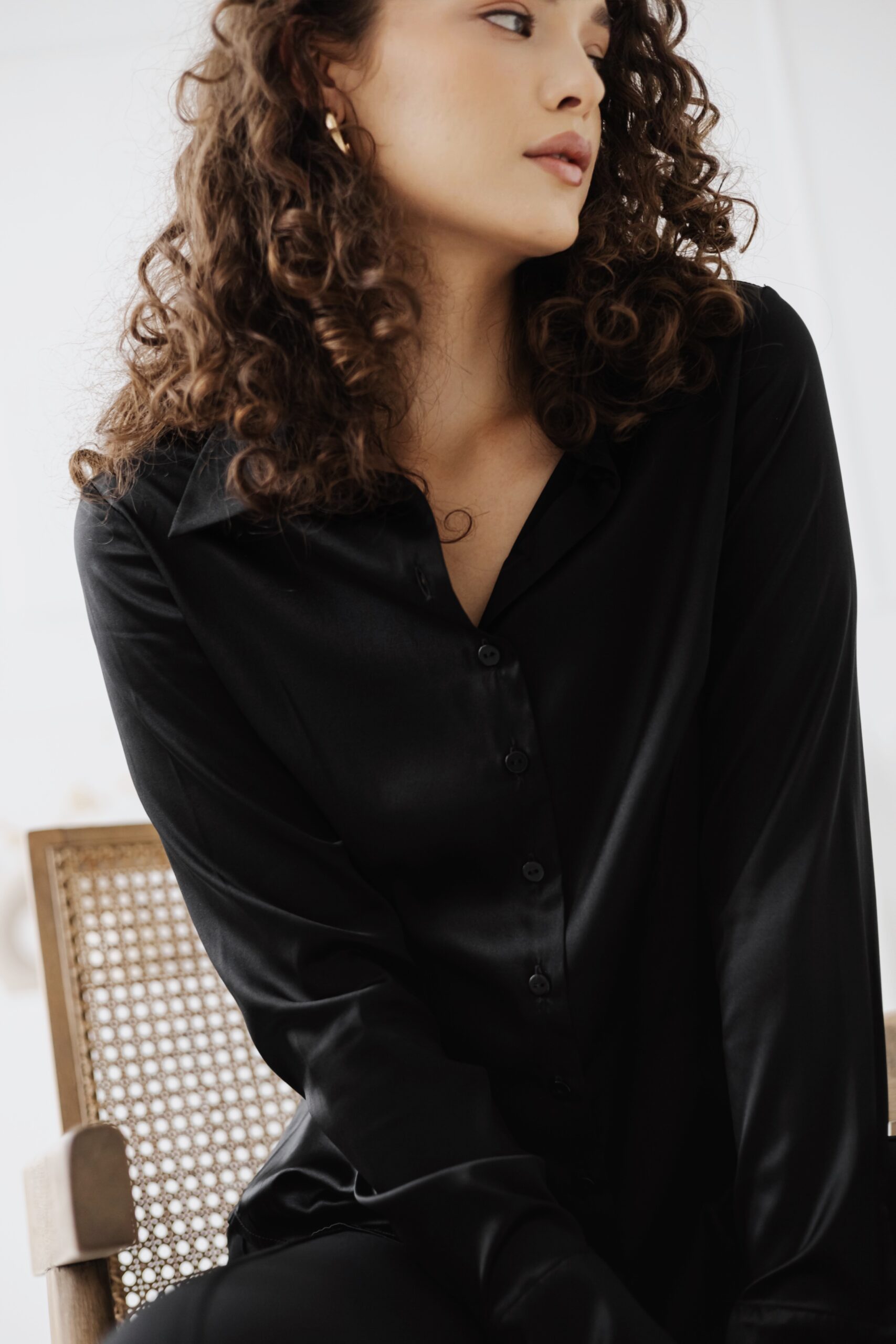 Koszula damska Luna wykonana z jedwabnej tkaniny z domieszką elastanu, o satynowym połysku. Krój regular fit zapewnia wygodę, a zaokrąglony dół klasycznej koszuli sprawia, że można nosić ją zarówno włożoną do spodni, jak i wyciągniętą na zewnątrz.