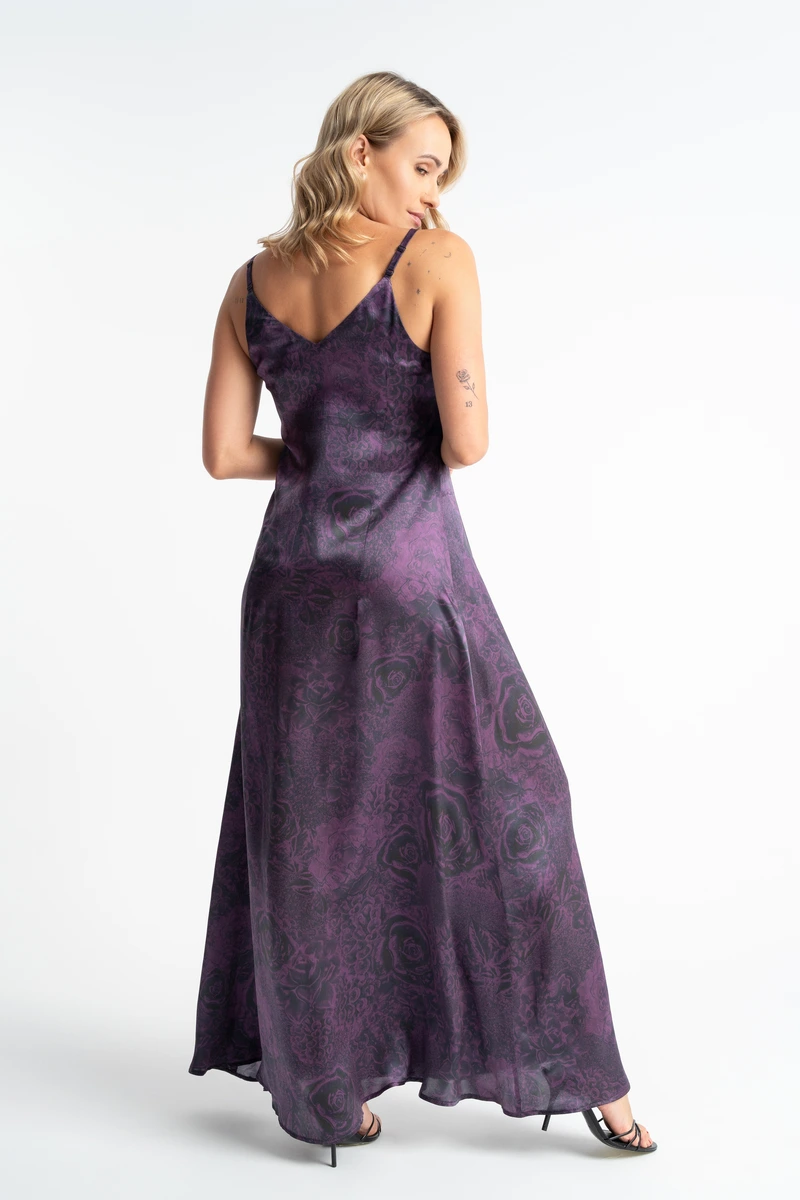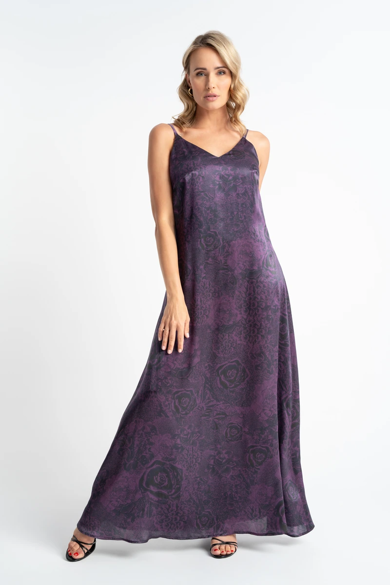 -30% OFFSukienka Purple Rose to przepiękna sukienka o kroju maxi w barwny wzór kwiatowy , wykonana z najwyższej jakości tkaniny jedwabnej . Delikatna struktura materiału sprawia że pomimo długości sukienka prezentuje się lekko i zwiewnie. Dyskretnie otula sylwetkę i zachwyca delikatnym blaskiem, na pewno doda odrobinę magii do waszej garderoby. Jest przewiewna, miękko się układa i nie przylega do ciała – idealna na ciepłe dni, a nawet na eleganckie okazje.